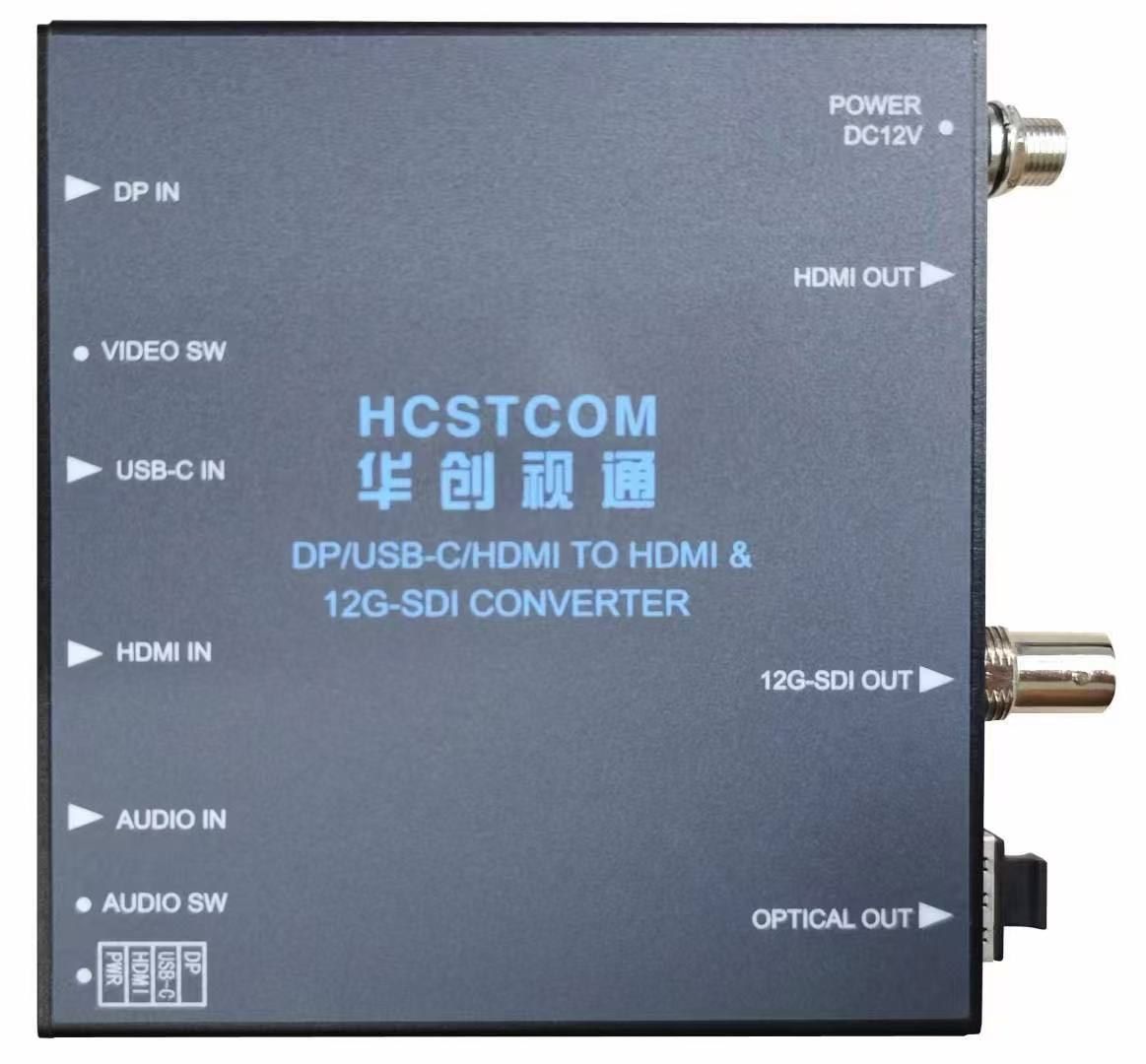 北京华创视通研发生产4K DisplayPort /USB-C/HDMI转4K HDMI & 12G-SDI转换器,将4K DisplayPort /USB-C/HDMI信号转换为HDMI 2.0,12G-SDI和SFP光钎接口同时输出,能够使超高清和4K的原始的图像和HFR实现高保真度。4K DisplayPort /USB-C/HDMI三选一输入,支持视频源输入切换功能;可选1路模拟音频3.5加嵌输入;还可以本公司12G-SDI系列产品配合使用,支持超高清4K DisplayPort /USB-C/HDMI的长距离光纤发射和接收。